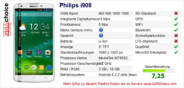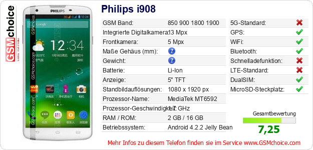Hast du eigene Webseite? Willst du die Informationen über Standarddaten des Handys Philips i908 irgendwo veröffentlichen? Das ist sehr einfach. Du kannst das Bild herunterladen oder kopieren und auf der Webseite folgenden Code hinzufügen:Das Einfügen von diesem Code verursacht das Anzeigen von dem folgenden Bild: