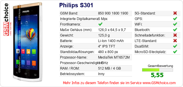 Hast du eigene Webseite? Willst du die Informationen über Standarddaten des Handys Philips S301 irgendwo veröffentlichen? Das ist sehr einfach. Du kannst das Bild herunterladen oder kopieren und auf der Webseite folgenden Code hinzufügen:Das Einfügen von diesem Code verursacht das Anzeigen von dem folgenden Bild: