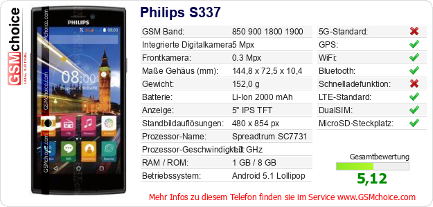 Hast du eigene Webseite? Willst du die Informationen über Standarddaten des Handys Philips S337 irgendwo veröffentlichen? Das ist sehr einfach. Du kannst das Bild herunterladen oder kopieren und auf der Webseite folgenden Code hinzufügen:Das Einfügen von diesem Code verursacht das Anzeigen von dem folgenden Bild:
