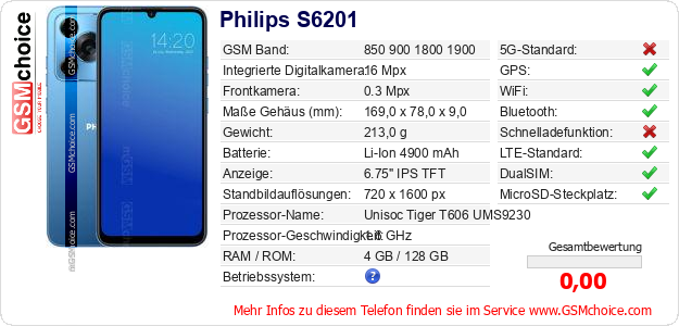 Hast du eigene Webseite? Willst du die Informationen über Standarddaten des Handys Philips S6201 irgendwo veröffentlichen? Das ist sehr einfach. Du kannst das Bild herunterladen oder kopieren und auf der Webseite folgenden Code hinzufügen:Das Einfügen von diesem Code verursacht das Anzeigen von dem folgenden Bild: