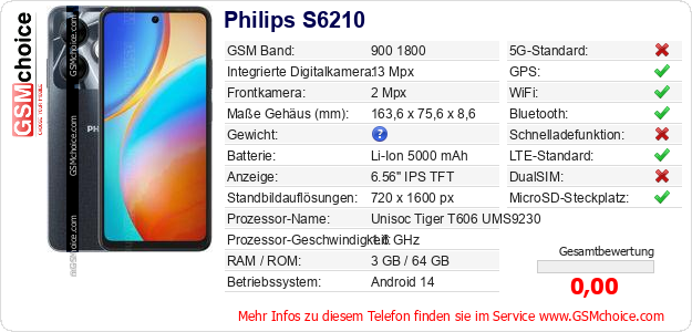 Hast du eigene Webseite? Willst du die Informationen über Standarddaten des Handys Philips S6210 irgendwo veröffentlichen? Das ist sehr einfach. Du kannst das Bild herunterladen oder kopieren und auf der Webseite folgenden Code hinzufügen:Das Einfügen von diesem Code verursacht das Anzeigen von dem folgenden Bild: