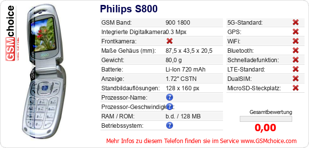 Hast du eigene Webseite? Willst du die Informationen über Standarddaten des Handys Philips S800 irgendwo veröffentlichen? Das ist sehr einfach. Du kannst das Bild herunterladen oder kopieren und auf der Webseite folgenden Code hinzufügen:Das Einfügen von diesem Code verursacht das Anzeigen von dem folgenden Bild: