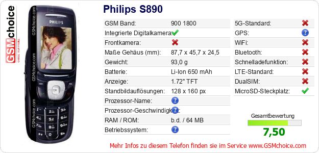 Hast du eigene Webseite? Willst du die Informationen über Standarddaten des Handys Philips S890 irgendwo veröffentlichen? Das ist sehr einfach. Du kannst das Bild herunterladen oder kopieren und auf der Webseite folgenden Code hinzufügen:Das Einfügen von diesem Code verursacht das Anzeigen von dem folgenden Bild: