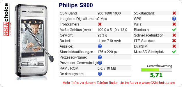 Hast du eigene Webseite? Willst du die Informationen über Standarddaten des Handys Philips S900 irgendwo veröffentlichen? Das ist sehr einfach. Du kannst das Bild herunterladen oder kopieren und auf der Webseite folgenden Code hinzufügen:Das Einfügen von diesem Code verursacht das Anzeigen von dem folgenden Bild:
