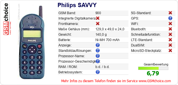Hast du eigene Webseite? Willst du die Informationen über Standarddaten des Handys Philips SAVVY irgendwo veröffentlichen? Das ist sehr einfach. Du kannst das Bild herunterladen oder kopieren und auf der Webseite folgenden Code hinzufügen:Das Einfügen von diesem Code verursacht das Anzeigen von dem folgenden Bild: