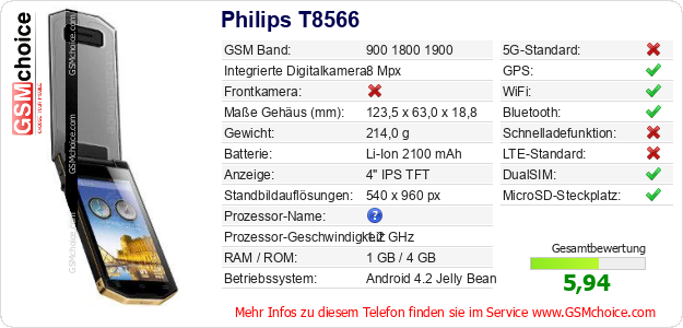 Hast du eigene Webseite? Willst du die Informationen über Standarddaten des Handys Philips T8566 irgendwo veröffentlichen? Das ist sehr einfach. Du kannst das Bild herunterladen oder kopieren und auf der Webseite folgenden Code hinzufügen:Das Einfügen von diesem Code verursacht das Anzeigen von dem folgenden Bild: