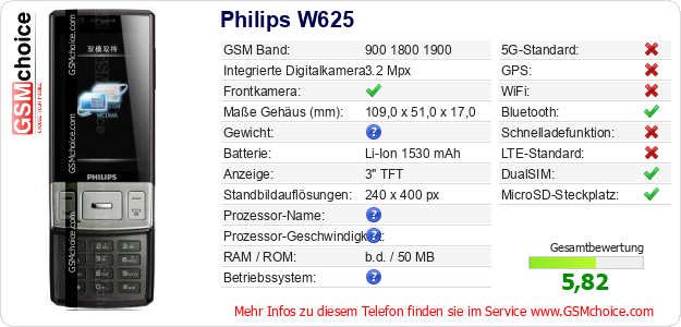 Hast du eigene Webseite? Willst du die Informationen über Standarddaten des Handys Philips W625 irgendwo veröffentlichen? Das ist sehr einfach. Du kannst das Bild herunterladen oder kopieren und auf der Webseite folgenden Code hinzufügen:Das Einfügen von diesem Code verursacht das Anzeigen von dem folgenden Bild: