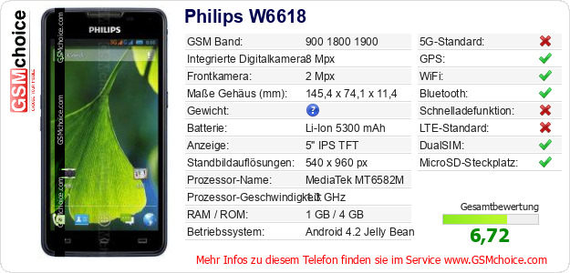 Hast du eigene Webseite? Willst du die Informationen über Standarddaten des Handys Philips W6618 irgendwo veröffentlichen? Das ist sehr einfach. Du kannst das Bild herunterladen oder kopieren und auf der Webseite folgenden Code hinzufügen:Das Einfügen von diesem Code verursacht das Anzeigen von dem folgenden Bild: