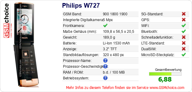 Hast du eigene Webseite? Willst du die Informationen über Standarddaten des Handys Philips W727 irgendwo veröffentlichen? Das ist sehr einfach. Du kannst das Bild herunterladen oder kopieren und auf der Webseite folgenden Code hinzufügen:Das Einfügen von diesem Code verursacht das Anzeigen von dem folgenden Bild:
