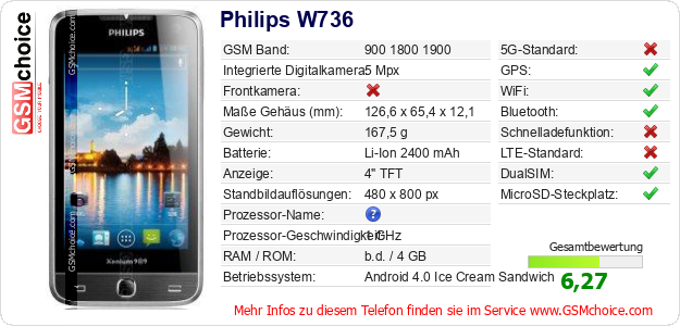 Hast du eigene Webseite? Willst du die Informationen über Standarddaten des Handys Philips W736 irgendwo veröffentlichen? Das ist sehr einfach. Du kannst das Bild herunterladen oder kopieren und auf der Webseite folgenden Code hinzufügen:Das Einfügen von diesem Code verursacht das Anzeigen von dem folgenden Bild: