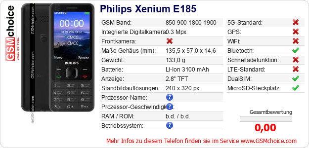 Hast du eigene Webseite? Willst du die Informationen über Standarddaten des Handys Philips Xenium E185 irgendwo veröffentlichen? Das ist sehr einfach. Du kannst das Bild herunterladen oder kopieren und auf der Webseite folgenden Code hinzufügen:Das Einfügen von diesem Code verursacht das Anzeigen von dem folgenden Bild: