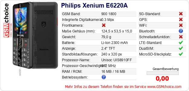 Hast du eigene Webseite? Willst du die Informationen über Standarddaten des Handys Philips Xenium E6220A irgendwo veröffentlichen? Das ist sehr einfach. Du kannst das Bild herunterladen oder kopieren und auf der Webseite folgenden Code hinzufügen:Das Einfügen von diesem Code verursacht das Anzeigen von dem folgenden Bild: