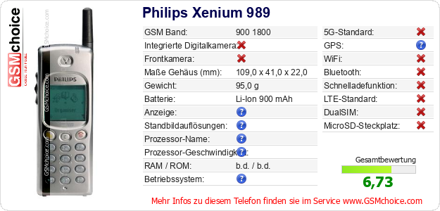 Hast du eigene Webseite? Willst du die Informationen über Standarddaten des Handys Philips Xenium 989 irgendwo veröffentlichen? Das ist sehr einfach. Du kannst das Bild herunterladen oder kopieren und auf der Webseite folgenden Code hinzufügen:Das Einfügen von diesem Code verursacht das Anzeigen von dem folgenden Bild: