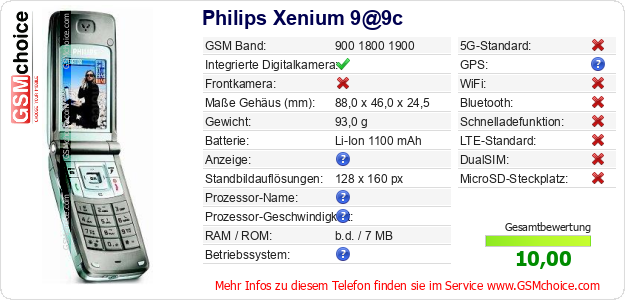 Hast du eigene Webseite? Willst du die Informationen über Standarddaten des Handys Philips Xenium 9@9c irgendwo veröffentlichen? Das ist sehr einfach. Du kannst das Bild herunterladen oder kopieren und auf der Webseite folgenden Code hinzufügen:Das Einfügen von diesem Code verursacht das Anzeigen von dem folgenden Bild: