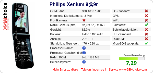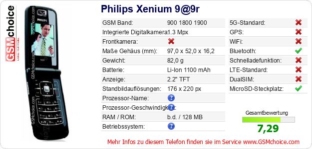 Hast du eigene Webseite? Willst du die Informationen über Standarddaten des Handys Philips Xenium 9@9r irgendwo veröffentlichen? Das ist sehr einfach. Du kannst das Bild herunterladen oder kopieren und auf der Webseite folgenden Code hinzufügen:Das Einfügen von diesem Code verursacht das Anzeigen von dem folgenden Bild:
