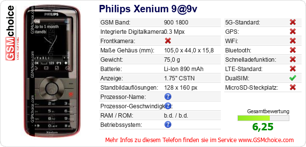 Hast du eigene Webseite? Willst du die Informationen über Standarddaten des Handys Philips Xenium 9@9v irgendwo veröffentlichen? Das ist sehr einfach. Du kannst das Bild herunterladen oder kopieren und auf der Webseite folgenden Code hinzufügen:Das Einfügen von diesem Code verursacht das Anzeigen von dem folgenden Bild: