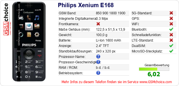 Hast du eigene Webseite? Willst du die Informationen über Standarddaten des Handys Philips Xenium E168 irgendwo veröffentlichen? Das ist sehr einfach. Du kannst das Bild herunterladen oder kopieren und auf der Webseite folgenden Code hinzufügen:Das Einfügen von diesem Code verursacht das Anzeigen von dem folgenden Bild:
