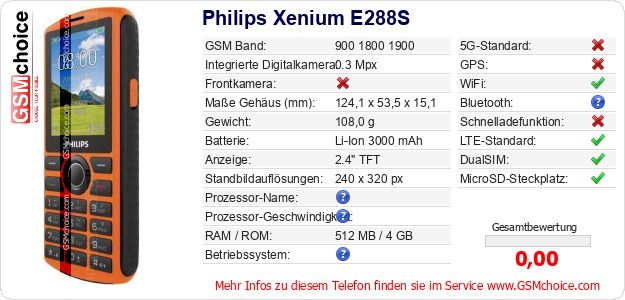 Hast du eigene Webseite? Willst du die Informationen über Standarddaten des Handys Philips Xenium E288S irgendwo veröffentlichen? Das ist sehr einfach. Du kannst das Bild herunterladen oder kopieren und auf der Webseite folgenden Code hinzufügen:Das Einfügen von diesem Code verursacht das Anzeigen von dem folgenden Bild: