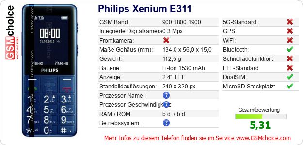Hast du eigene Webseite? Willst du die Informationen über Standarddaten des Handys Philips Xenium E311 irgendwo veröffentlichen? Das ist sehr einfach. Du kannst das Bild herunterladen oder kopieren und auf der Webseite folgenden Code hinzufügen:Das Einfügen von diesem Code verursacht das Anzeigen von dem folgenden Bild: