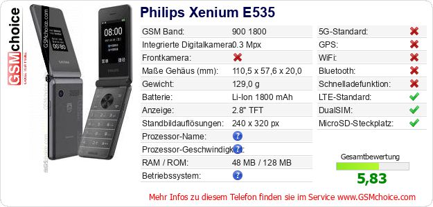 Hast du eigene Webseite? Willst du die Informationen über Standarddaten des Handys Philips Xenium E535 irgendwo veröffentlichen? Das ist sehr einfach. Du kannst das Bild herunterladen oder kopieren und auf der Webseite folgenden Code hinzufügen:Das Einfügen von diesem Code verursacht das Anzeigen von dem folgenden Bild: