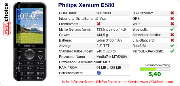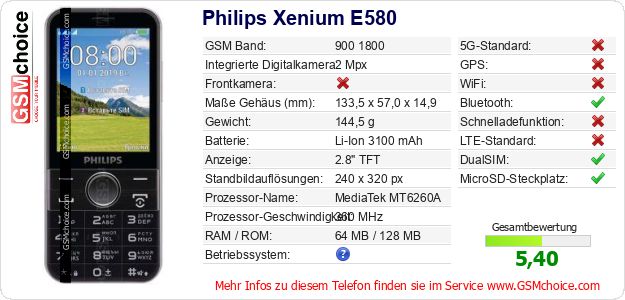 Hast du eigene Webseite? Willst du die Informationen über Standarddaten des Handys Philips Xenium E580 irgendwo veröffentlichen? Das ist sehr einfach. Du kannst das Bild herunterladen oder kopieren und auf der Webseite folgenden Code hinzufügen:Das Einfügen von diesem Code verursacht das Anzeigen von dem folgenden Bild: