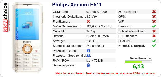 Hast du eigene Webseite? Willst du die Informationen über Standarddaten des Handys Philips Xenium F511 irgendwo veröffentlichen? Das ist sehr einfach. Du kannst das Bild herunterladen oder kopieren und auf der Webseite folgenden Code hinzufügen:Das Einfügen von diesem Code verursacht das Anzeigen von dem folgenden Bild: