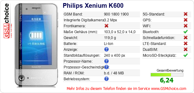 Hast du eigene Webseite? Willst du die Informationen über Standarddaten des Handys Philips Xenium K600 irgendwo veröffentlichen? Das ist sehr einfach. Du kannst das Bild herunterladen oder kopieren und auf der Webseite folgenden Code hinzufügen:Das Einfügen von diesem Code verursacht das Anzeigen von dem folgenden Bild: