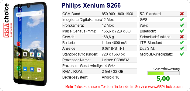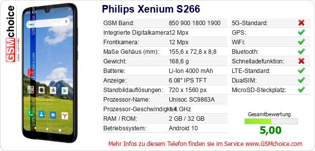 Hast du eigene Webseite? Willst du die Informationen über Standarddaten des Handys Philips Xenium S266 irgendwo veröffentlichen? Das ist sehr einfach. Du kannst das Bild herunterladen oder kopieren und auf der Webseite folgenden Code hinzufügen:Das Einfügen von diesem Code verursacht das Anzeigen von dem folgenden Bild: