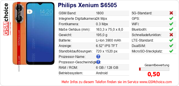 Hast du eigene Webseite? Willst du die Informationen über Standarddaten des Handys Philips Xenium S6505 irgendwo veröffentlichen? Das ist sehr einfach. Du kannst das Bild herunterladen oder kopieren und auf der Webseite folgenden Code hinzufügen:Das Einfügen von diesem Code verursacht das Anzeigen von dem folgenden Bild: