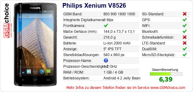 Daten des Mobiltelefons Philips Xenium V8526 auf Ihrer Seite