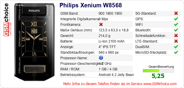 Hast du eigene Webseite? Willst du die Informationen über Standarddaten des Handys Philips Xenium W8568 irgendwo veröffentlichen? Das ist sehr einfach. Du kannst das Bild herunterladen oder kopieren und auf der Webseite folgenden Code hinzufügen:Das Einfügen von diesem Code verursacht das Anzeigen von dem folgenden Bild:
