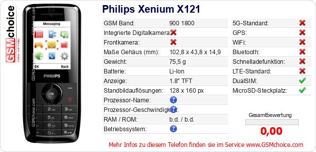 Hast du eigene Webseite? Willst du die Informationen über Standarddaten des Handys Philips Xenium X121 irgendwo veröffentlichen? Das ist sehr einfach. Du kannst das Bild herunterladen oder kopieren und auf der Webseite folgenden Code hinzufügen:Das Einfügen von diesem Code verursacht das Anzeigen von dem folgenden Bild: