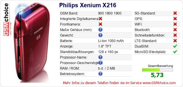 Hast du eigene Webseite? Willst du die Informationen über Standarddaten des Handys Philips Xenium X216 irgendwo veröffentlichen? Das ist sehr einfach. Du kannst das Bild herunterladen oder kopieren und auf der Webseite folgenden Code hinzufügen:Das Einfügen von diesem Code verursacht das Anzeigen von dem folgenden Bild: