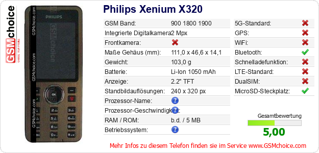 Hast du eigene Webseite? Willst du die Informationen über Standarddaten des Handys Philips Xenium X320 irgendwo veröffentlichen? Das ist sehr einfach. Du kannst das Bild herunterladen oder kopieren und auf der Webseite folgenden Code hinzufügen:Das Einfügen von diesem Code verursacht das Anzeigen von dem folgenden Bild: