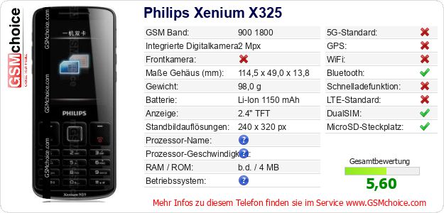 Hast du eigene Webseite? Willst du die Informationen über Standarddaten des Handys Philips Xenium X325 irgendwo veröffentlichen? Das ist sehr einfach. Du kannst das Bild herunterladen oder kopieren und auf der Webseite folgenden Code hinzufügen:Das Einfügen von diesem Code verursacht das Anzeigen von dem folgenden Bild: