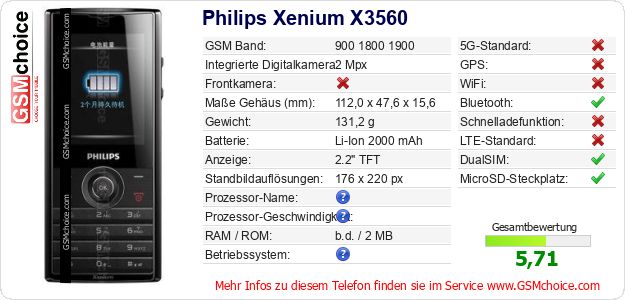 Hast du eigene Webseite? Willst du die Informationen über Standarddaten des Handys Philips Xenium X3560 irgendwo veröffentlichen? Das ist sehr einfach. Du kannst das Bild herunterladen oder kopieren und auf der Webseite folgenden Code hinzufügen:Das Einfügen von diesem Code verursacht das Anzeigen von dem folgenden Bild: