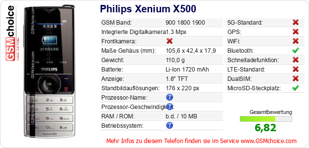 Hast du eigene Webseite? Willst du die Informationen über Standarddaten des Handys Philips Xenium X500 irgendwo veröffentlichen? Das ist sehr einfach. Du kannst das Bild herunterladen oder kopieren und auf der Webseite folgenden Code hinzufügen:Das Einfügen von diesem Code verursacht das Anzeigen von dem folgenden Bild:
