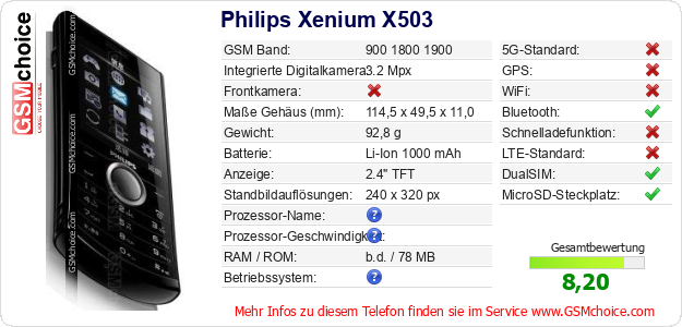 Hast du eigene Webseite? Willst du die Informationen über Standarddaten des Handys Philips Xenium X503 irgendwo veröffentlichen? Das ist sehr einfach. Du kannst das Bild herunterladen oder kopieren und auf der Webseite folgenden Code hinzufügen:Das Einfügen von diesem Code verursacht das Anzeigen von dem folgenden Bild: