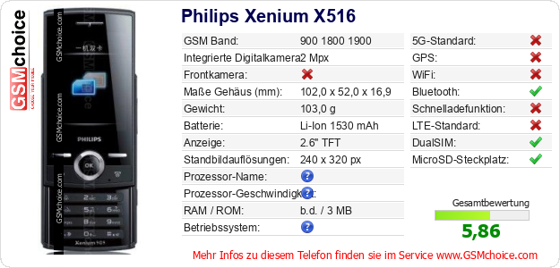 Hast du eigene Webseite? Willst du die Informationen über Standarddaten des Handys Philips Xenium X516 irgendwo veröffentlichen? Das ist sehr einfach. Du kannst das Bild herunterladen oder kopieren und auf der Webseite folgenden Code hinzufügen:Das Einfügen von diesem Code verursacht das Anzeigen von dem folgenden Bild:
