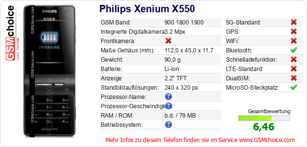 Hast du eigene Webseite? Willst du die Informationen über Standarddaten des Handys Philips Xenium X550 irgendwo veröffentlichen? Das ist sehr einfach. Du kannst das Bild herunterladen oder kopieren und auf der Webseite folgenden Code hinzufügen:Das Einfügen von diesem Code verursacht das Anzeigen von dem folgenden Bild: