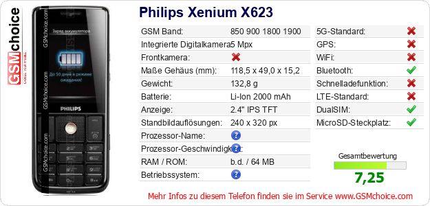 Hast du eigene Webseite? Willst du die Informationen über Standarddaten des Handys Philips Xenium X623 irgendwo veröffentlichen? Das ist sehr einfach. Du kannst das Bild herunterladen oder kopieren und auf der Webseite folgenden Code hinzufügen:Das Einfügen von diesem Code verursacht das Anzeigen von dem folgenden Bild: