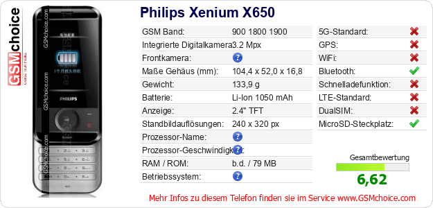 Hast du eigene Webseite? Willst du die Informationen über Standarddaten des Handys Philips Xenium X650 irgendwo veröffentlichen? Das ist sehr einfach. Du kannst das Bild herunterladen oder kopieren und auf der Webseite folgenden Code hinzufügen:Das Einfügen von diesem Code verursacht das Anzeigen von dem folgenden Bild: