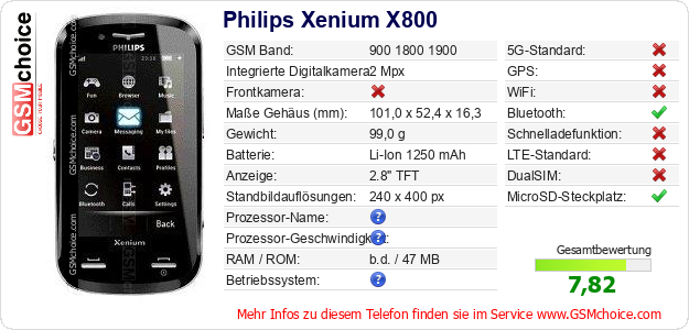Hast du eigene Webseite? Willst du die Informationen über Standarddaten des Handys Philips Xenium X800 irgendwo veröffentlichen? Das ist sehr einfach. Du kannst das Bild herunterladen oder kopieren und auf der Webseite folgenden Code hinzufügen:Das Einfügen von diesem Code verursacht das Anzeigen von dem folgenden Bild: