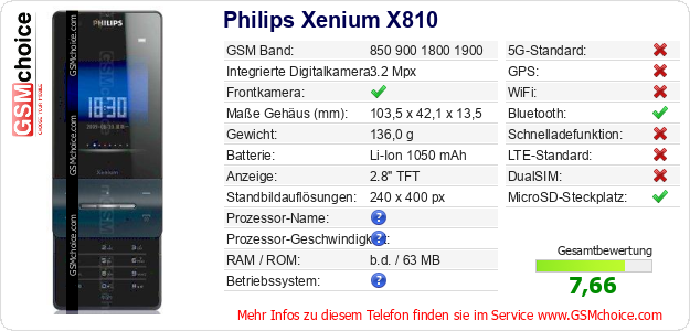 Hast du eigene Webseite? Willst du die Informationen über Standarddaten des Handys Philips Xenium X810 irgendwo veröffentlichen? Das ist sehr einfach. Du kannst das Bild herunterladen oder kopieren und auf der Webseite folgenden Code hinzufügen:Das Einfügen von diesem Code verursacht das Anzeigen von dem folgenden Bild: