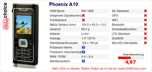 Hast du eigene Webseite? Willst du die Informationen über Standarddaten des Handys Phoenix A10 irgendwo veröffentlichen? Das ist sehr einfach. Du kannst das Bild herunterladen oder kopieren und auf der Webseite folgenden Code hinzufügen:Das Einfügen von diesem Code verursacht das Anzeigen von dem folgenden Bild: