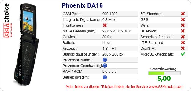 Hast du eigene Webseite? Willst du die Informationen über Standarddaten des Handys Phoenix DA16 irgendwo veröffentlichen? Das ist sehr einfach. Du kannst das Bild herunterladen oder kopieren und auf der Webseite folgenden Code hinzufügen:Das Einfügen von diesem Code verursacht das Anzeigen von dem folgenden Bild: