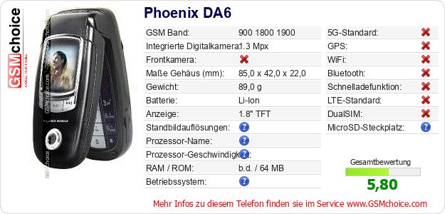 Hast du eigene Webseite? Willst du die Informationen über Standarddaten des Handys Phoenix DA6 irgendwo veröffentlichen? Das ist sehr einfach. Du kannst das Bild herunterladen oder kopieren und auf der Webseite folgenden Code hinzufügen:Das Einfügen von diesem Code verursacht das Anzeigen von dem folgenden Bild: