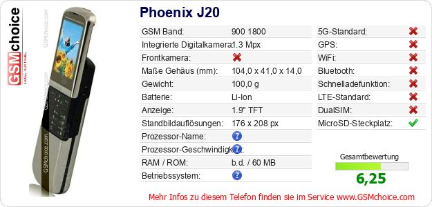 Hast du eigene Webseite? Willst du die Informationen über Standarddaten des Handys Phoenix J20 irgendwo veröffentlichen? Das ist sehr einfach. Du kannst das Bild herunterladen oder kopieren und auf der Webseite folgenden Code hinzufügen:Das Einfügen von diesem Code verursacht das Anzeigen von dem folgenden Bild: