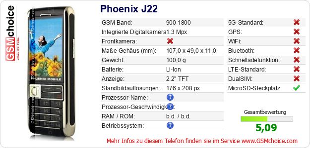 Hast du eigene Webseite? Willst du die Informationen über Standarddaten des Handys Phoenix J22 irgendwo veröffentlichen? Das ist sehr einfach. Du kannst das Bild herunterladen oder kopieren und auf der Webseite folgenden Code hinzufügen:Das Einfügen von diesem Code verursacht das Anzeigen von dem folgenden Bild: