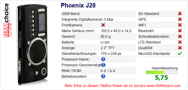 Hast du eigene Webseite? Willst du die Informationen über Standarddaten des Handys Phoenix J28 irgendwo veröffentlichen? Das ist sehr einfach. Du kannst das Bild herunterladen oder kopieren und auf der Webseite folgenden Code hinzufügen:Das Einfügen von diesem Code verursacht das Anzeigen von dem folgenden Bild: